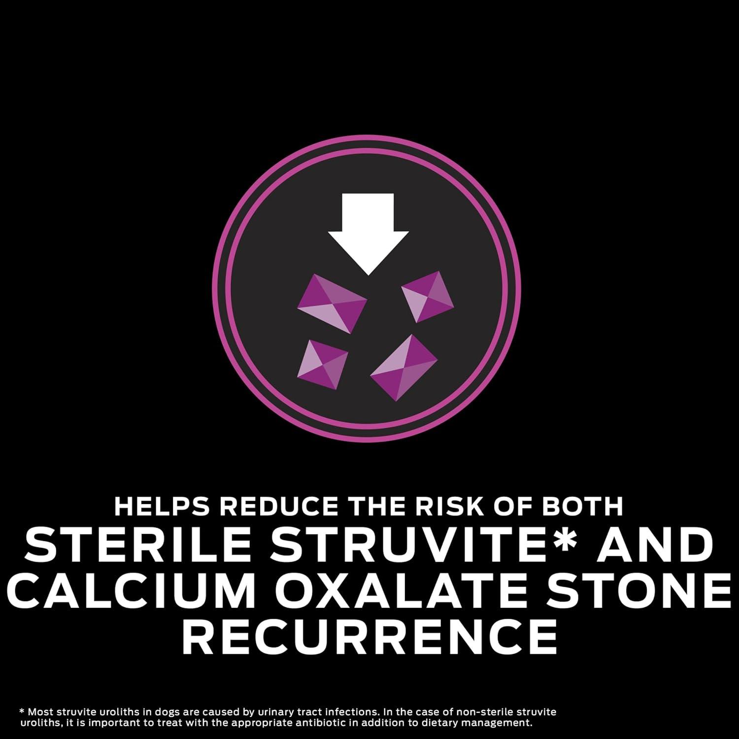 Talk to your veterinarian to see if Purina Pro Plan Veterinary Diets UR Urinary Ox/St Canine Formula Dry Dog Food could benefit your dog. This great-tasting adult dog food is made with high-quality ingredients and is formulated to promote a urinary environment unfavorable to the development of both sterile struvite* and calcium oxalate crystals while also helping reduce the risk of recurrence of these stones. This dog kibble also helps dissolve sterile struvite stones*. Also included are antioxidants and high-quality protein for dogs. The science behind this therapeutic diet represents a collaboration between Purina nutritionists, researchers and veterinarians. * Most struvite stones in dogs are caused by urinary tract infections. In the case of non-sterile struvite stones, it is important to discuss antibiotic therapy with your veterinarian in addition to dietary management.